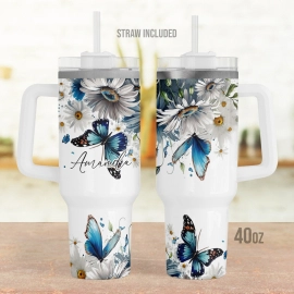 Butterfly And Daisy Personalized, Custom Floral Blue Butterfly 30oz or 40oz Tumbler with Handle, Gift for Her HG
